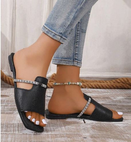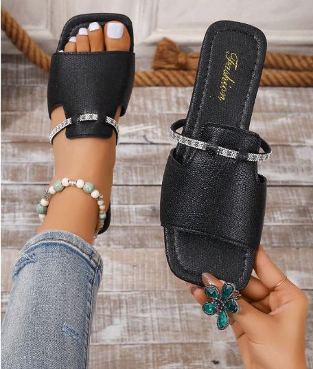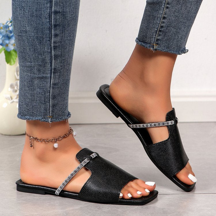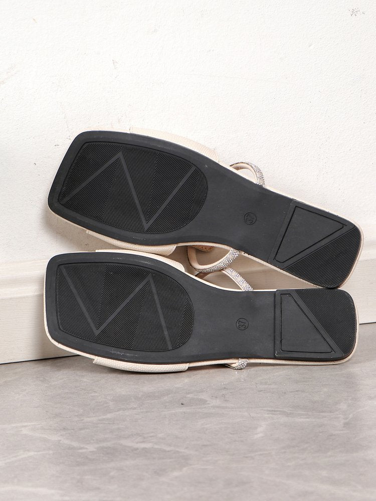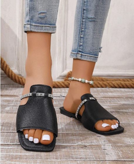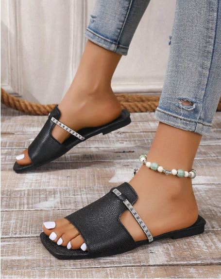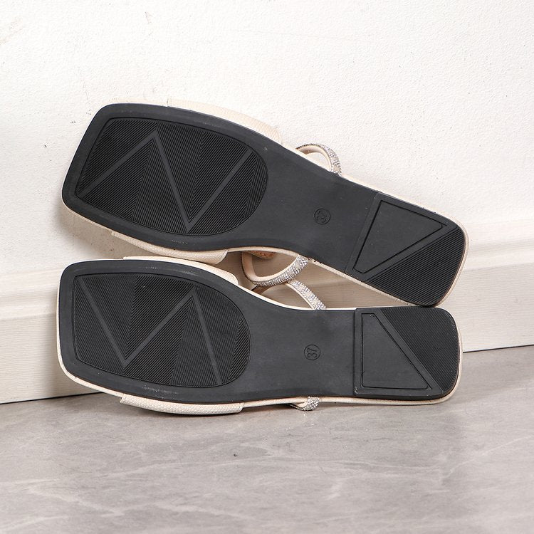 Fashionable And Comfortable Square Toe Rhinestone Detail Slip-On Flat Sandals