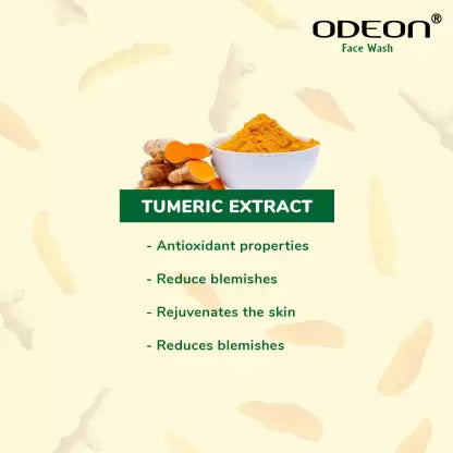 Turmeric an ancient Indian herb is well known for its brightening benefits. Pleasantly fragranced Odeon face wash, enriched with the natural goodness of Turmeric not only gently cleans and removes the pollutants from the pores but also helps fight pimples & blackheads while leaving a healthy & glowing skin.50ml