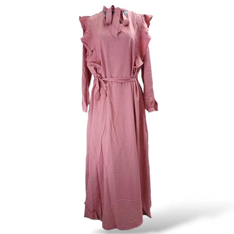 Free size Full sleeve maxi belted dress, old rose color, with Neck Bow