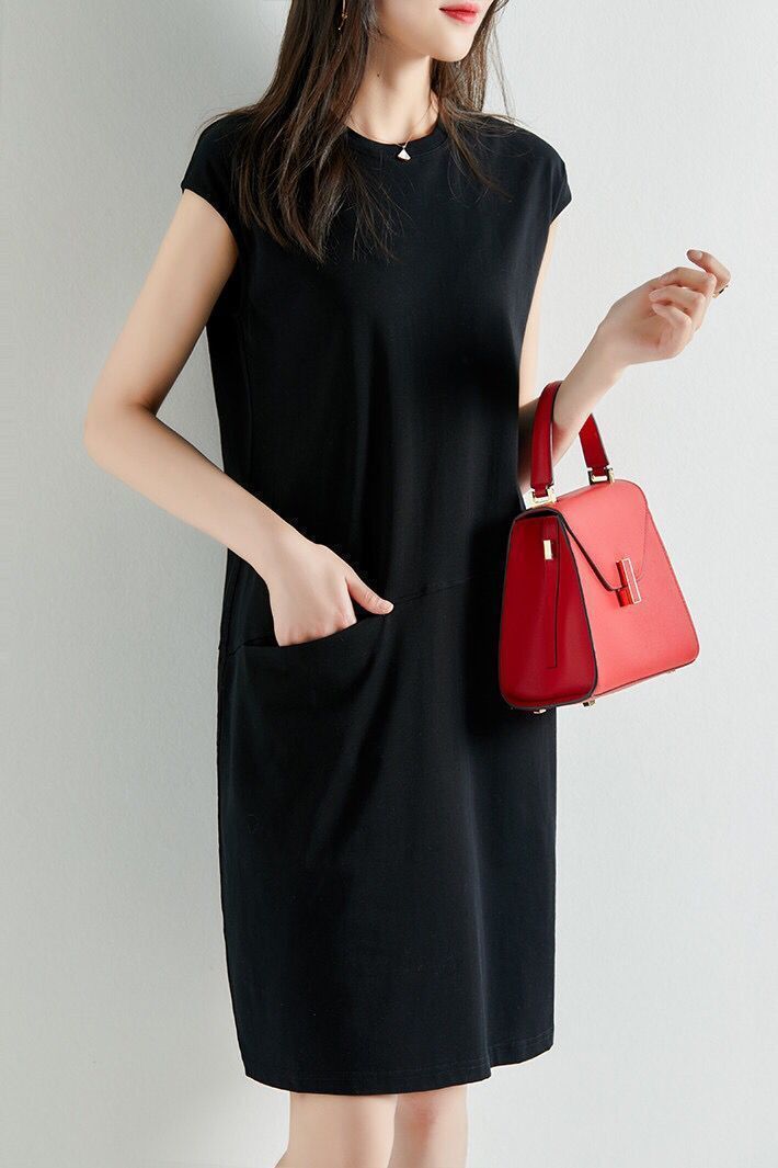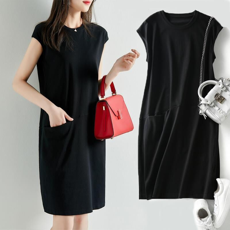Women's Short Sleeve O-Neck T-shirt Dress Loose Mid Waist Solid Midi Dress Soft Elegant Knee-Length Pockets Dress