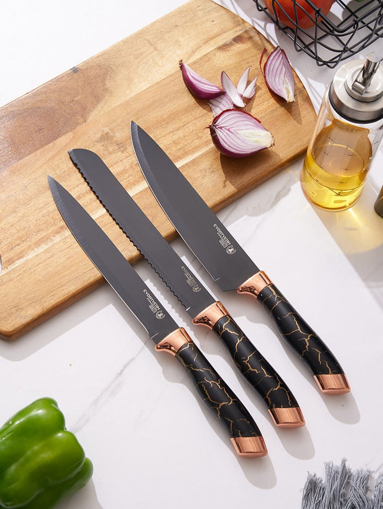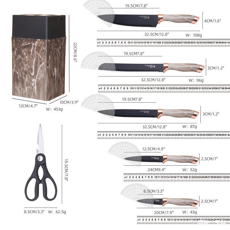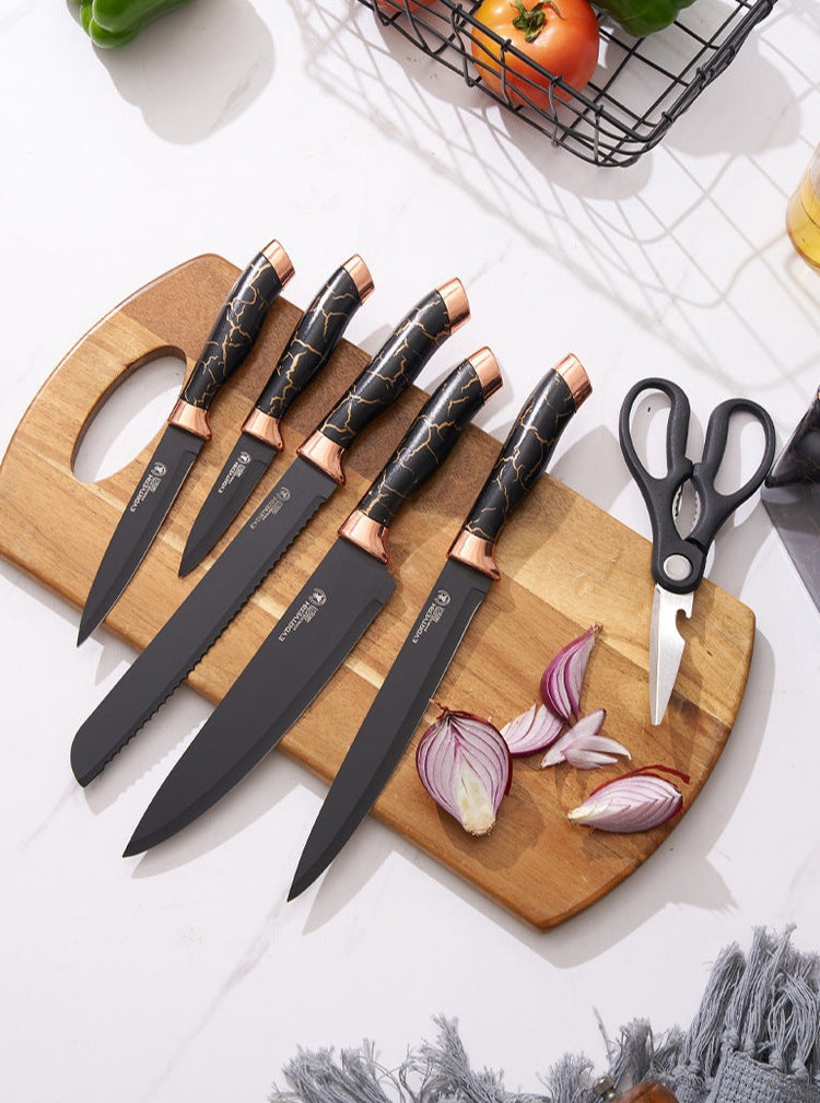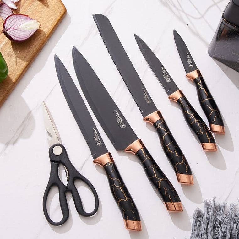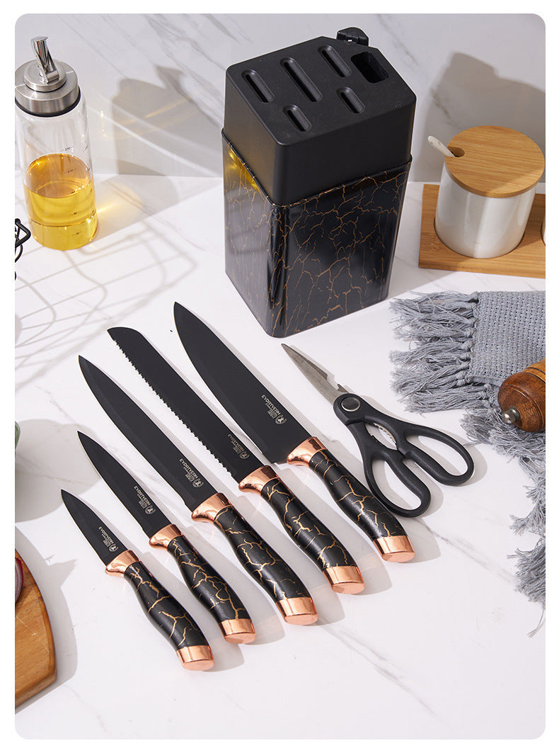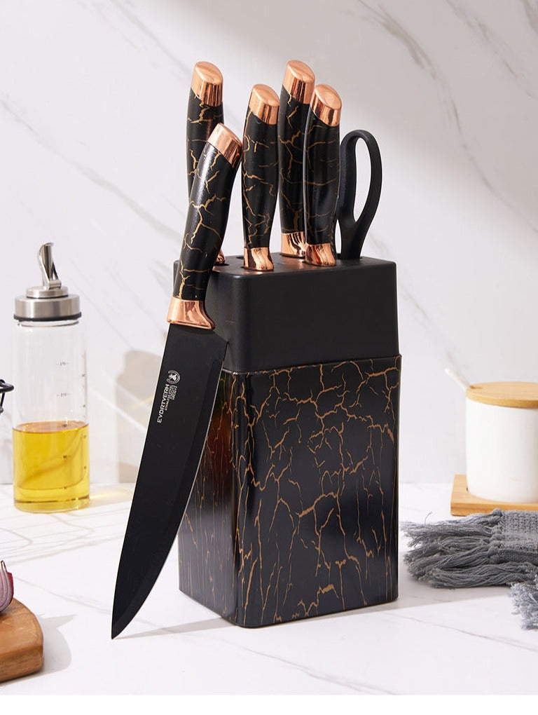 7pcs Kitchen Chef Knife Set Stainless Steel Carving Cheese Pizza Black Marble Coating Knife with Holder