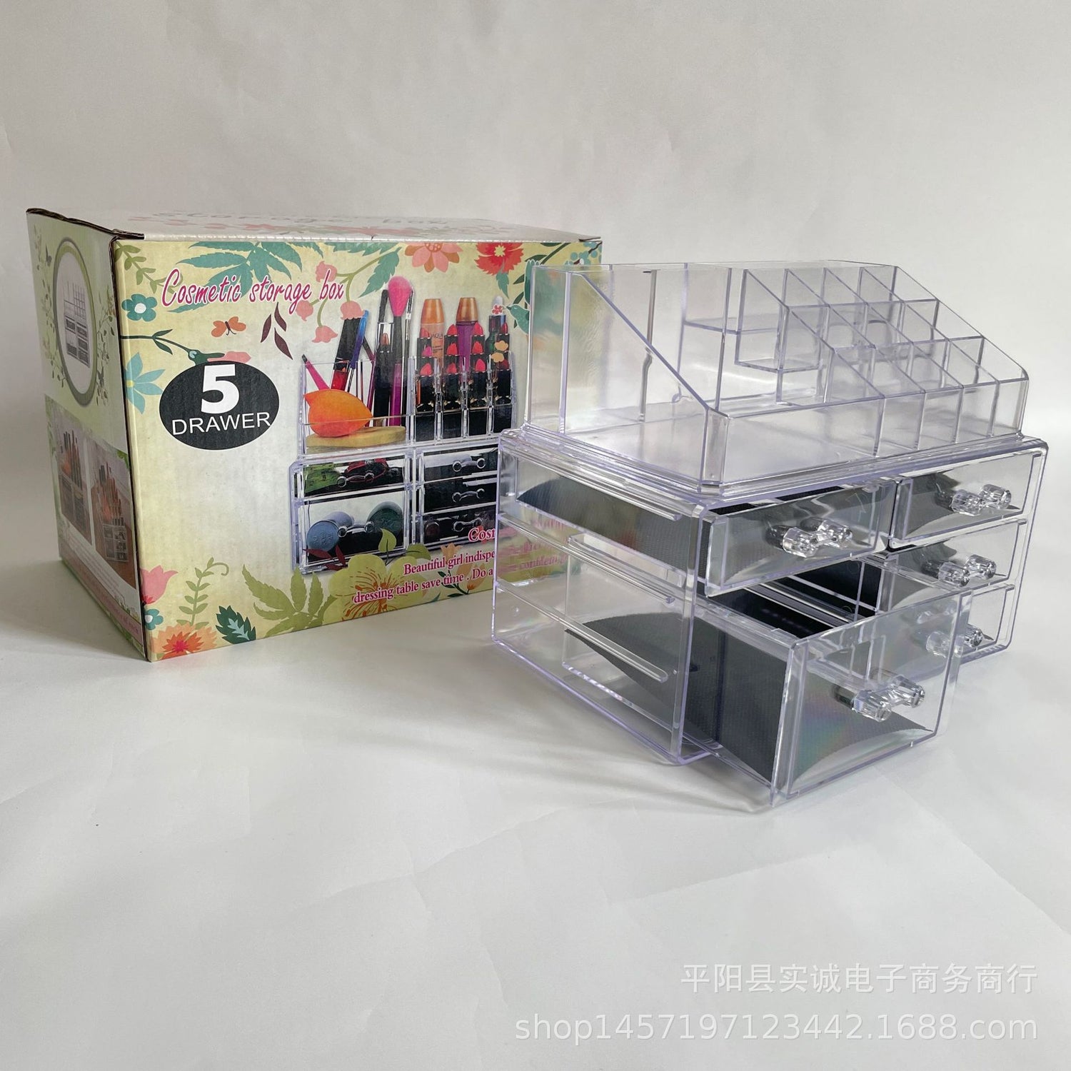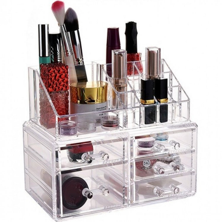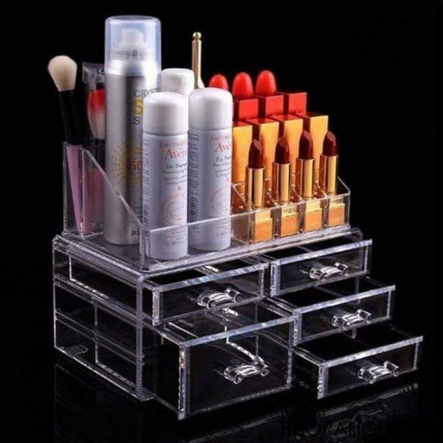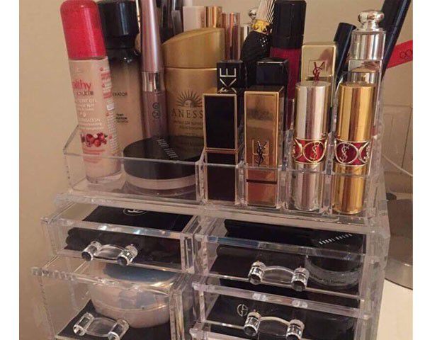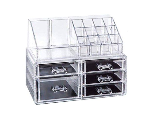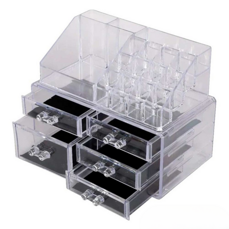 LARGE CAPACITY - Our clear makeup organizer include two separable parts. The bottom part with 5 drawer, which accommodate your cosmetics and jewelry; The top 16 slots keeps makeup protected, upright, specially for lipsticks, foundations, blushes, eye shadows, grooming tools