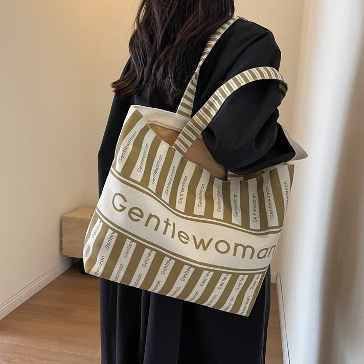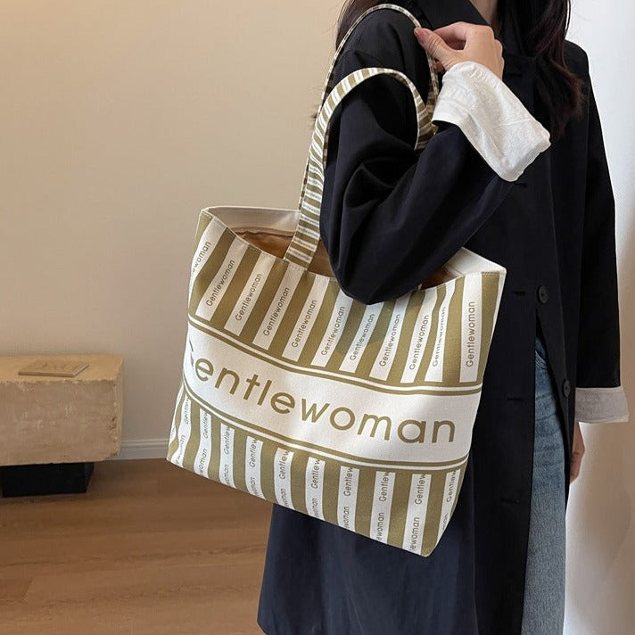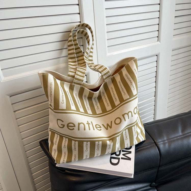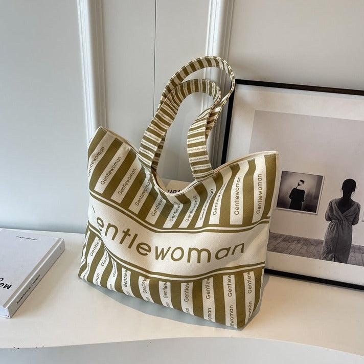 Large Canvas Tote Bag with Zipper Closure Khaki Striped Print
