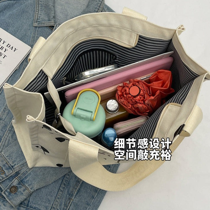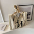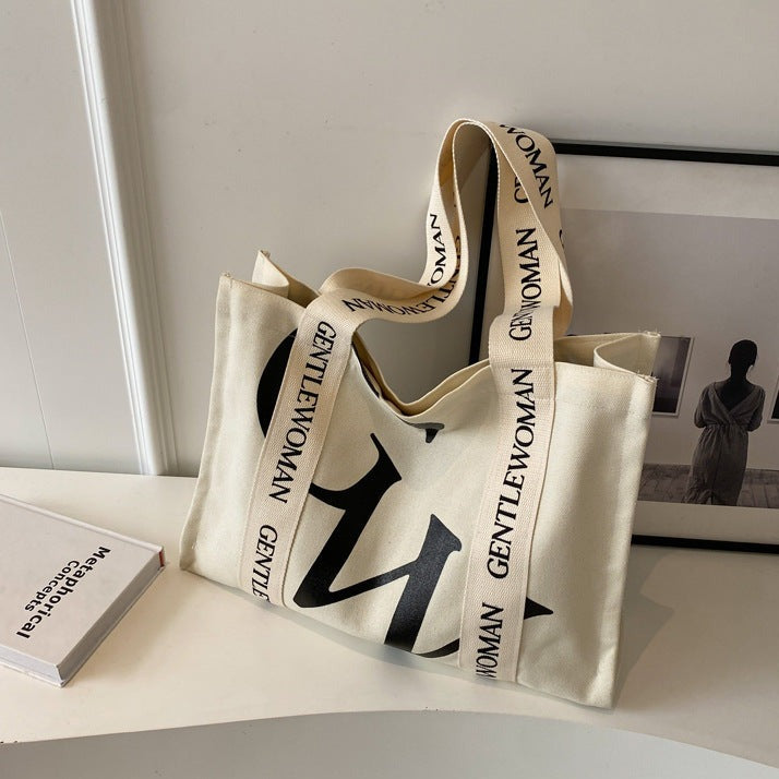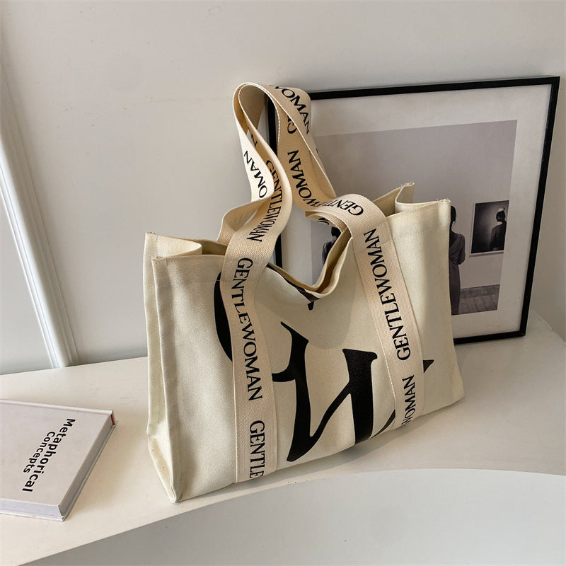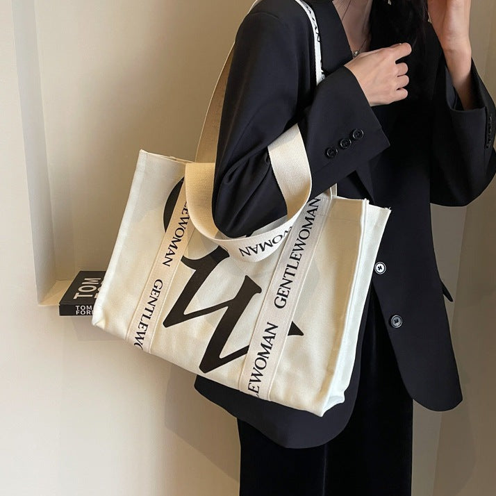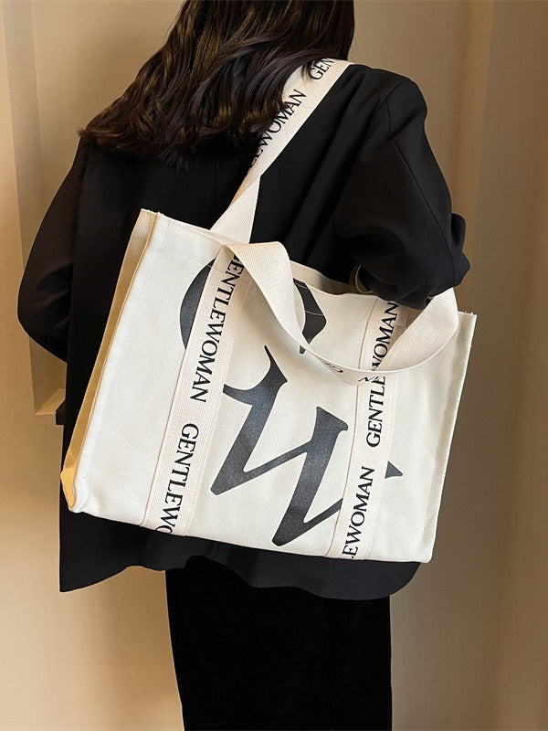 Large Letter Printed Canvas Shoulder Bag off-white color