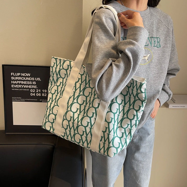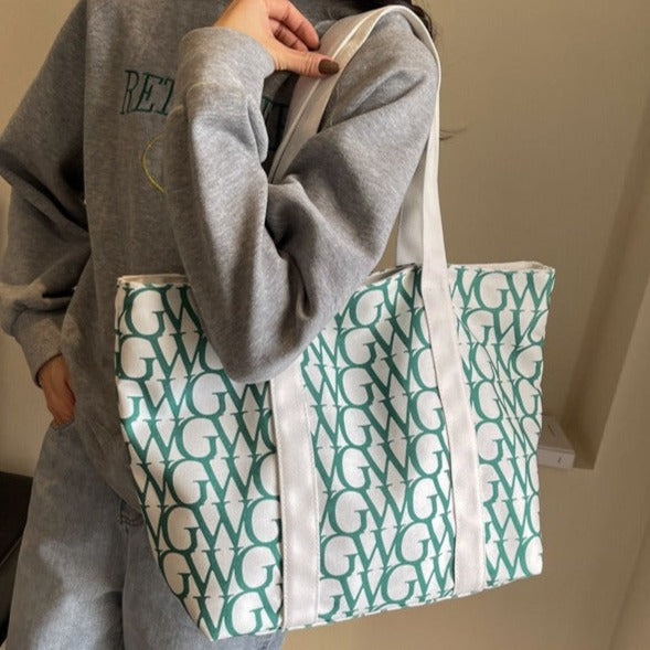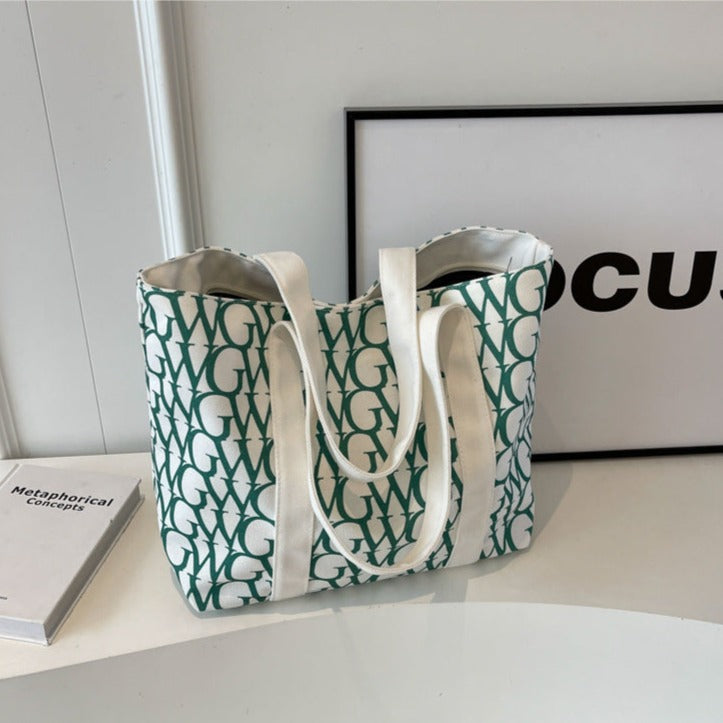 New Printed Casual Large Capacity Tote Shoulder Bag off-white with green print