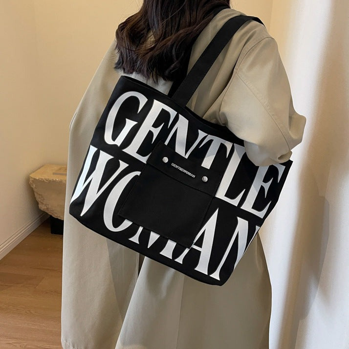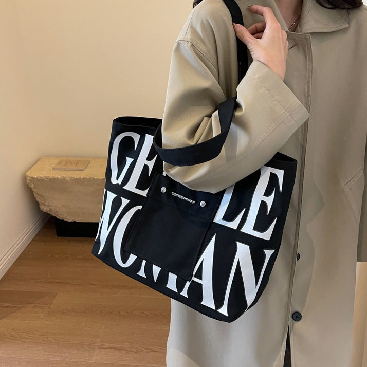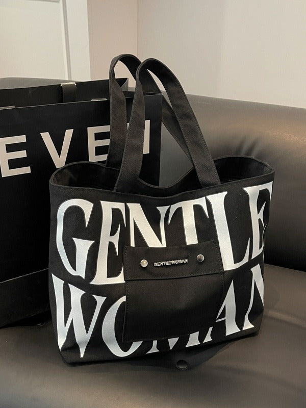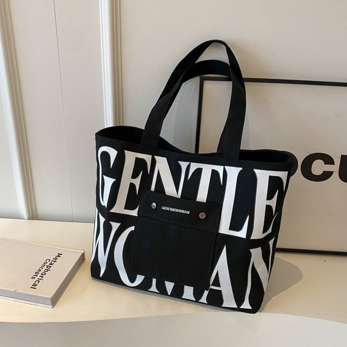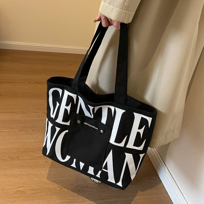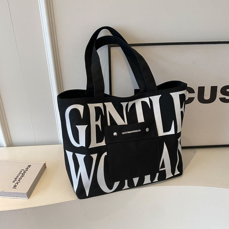 Large Capacity Letter Printed Tote Canvas Handbag Shoulder Bag in Black color