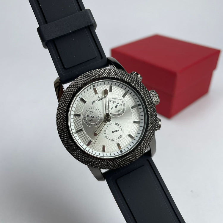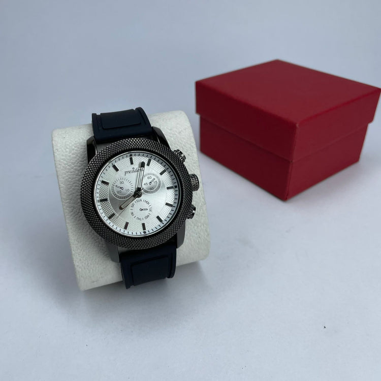 President Sports Japan Quartz Round Stainless Steel Watch Black Silicon/Rubber Band. White Dial